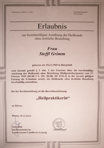 Am 04.12.14 habe ich in einer drei jährigen Ausbildung die offizielle Prüfung zum Heilpraktiker erfolgreich in Löbau abgeschlossen.